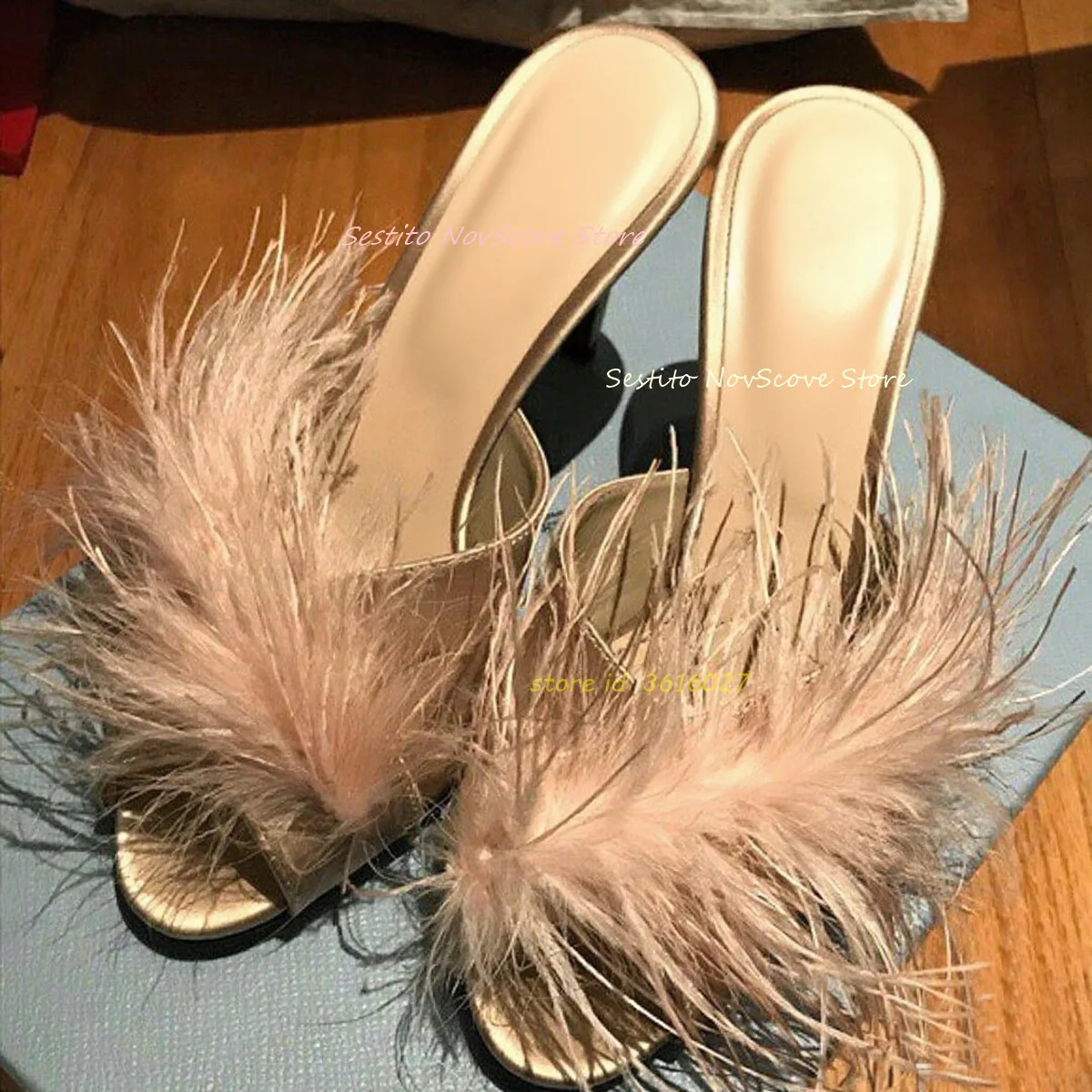 Lady Sexy Stiletto Heel Open Toe Fur Mules High Heels Pumps Footwear Runway New Arrive Fur Feather Summer Outdoors Pumps Size