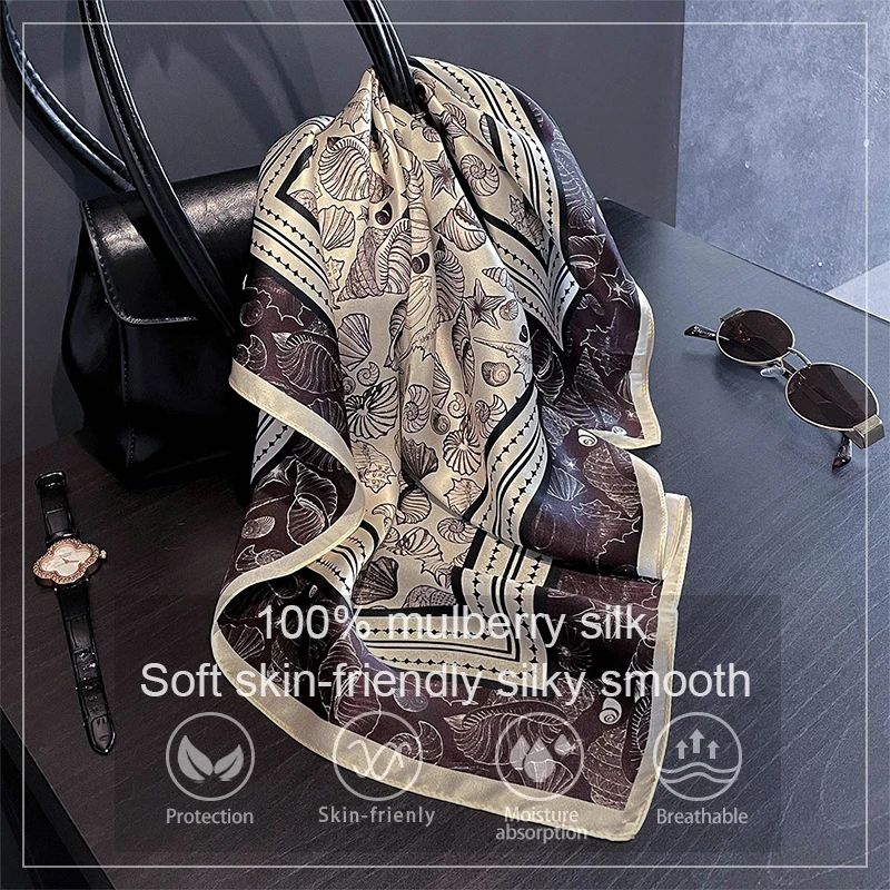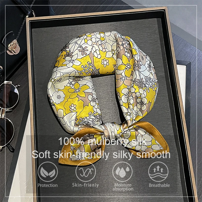 Luxury 100% Real Silk Scarf Women Spring Floral Bandana Shawl Lady Mulberry Silk Neckerchief Handkerchief Female Wrap 53cm