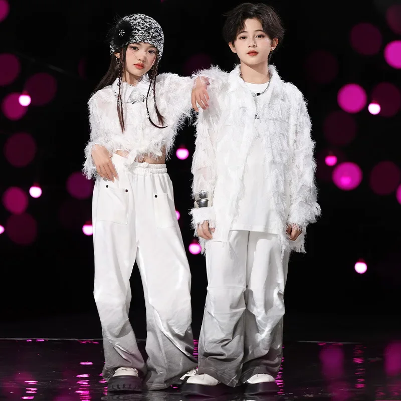Kid Cool Hip Hop Clothing Feather Shirt Crop Top White Black Casual Wide Ruched Pants for Girl Boy Jazz Dance Costumes Clothes