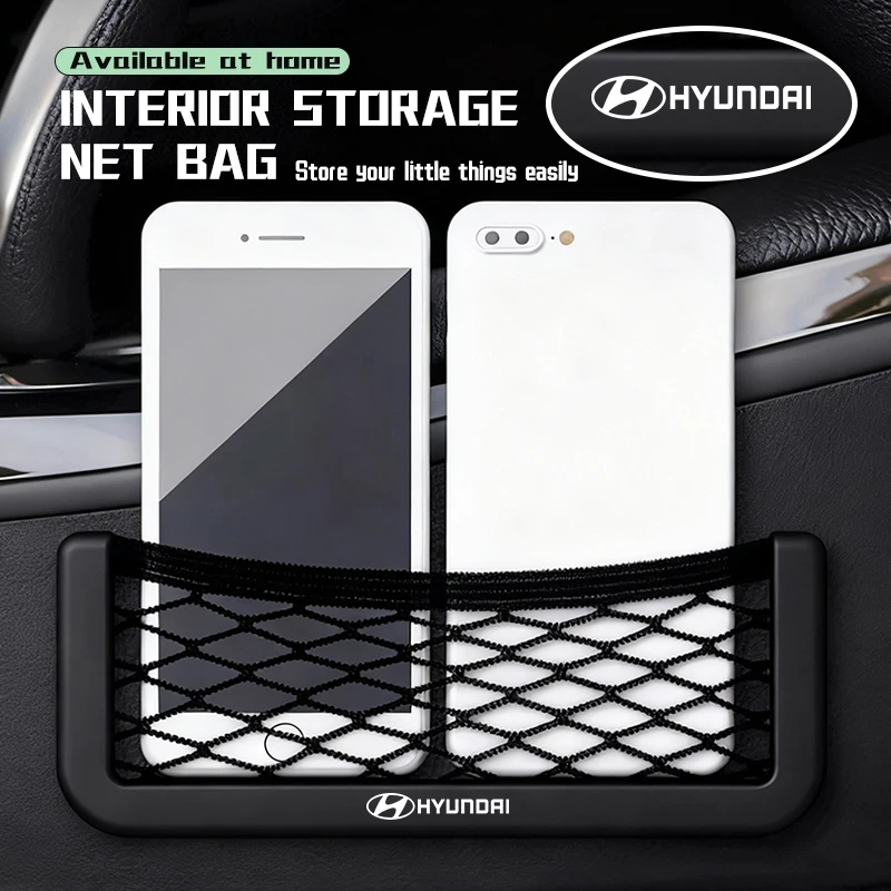 For Hyundai Car Logo Organizer Mesh Net Pocket Phone Holder Phone Storage Bag Accessories Tucson NX4 IX35 H7 2022 2021 2020 2019