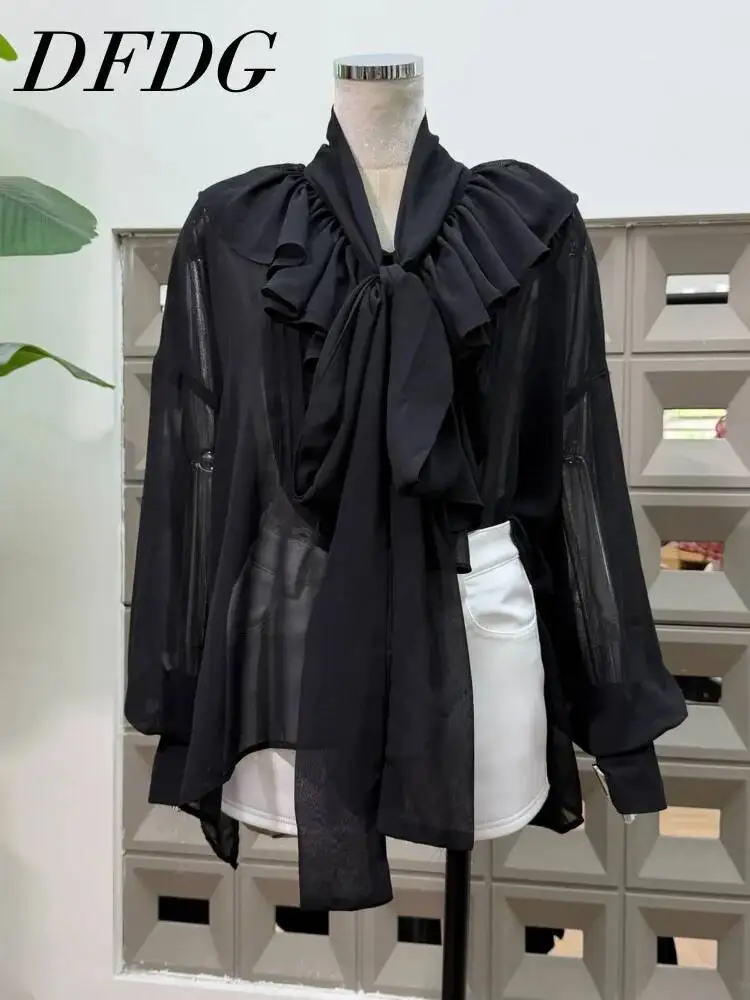 DFDG 2025 Spring Summer Women's Minimalist Sheer Loose Drop Shoulder Blouse Ruffle Ribbon Tie Lace Trim Versatile Short Top Set