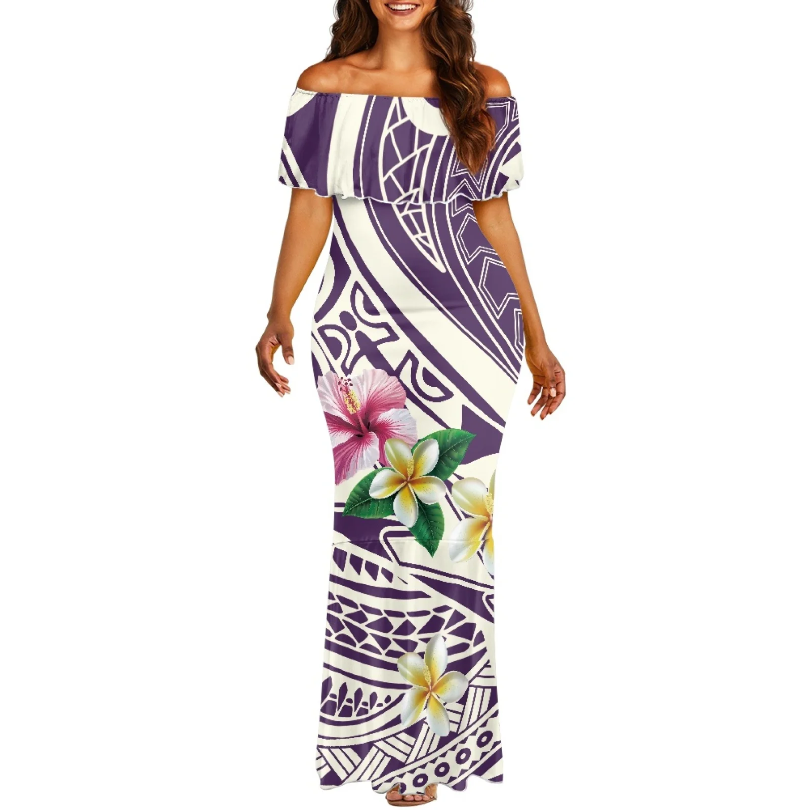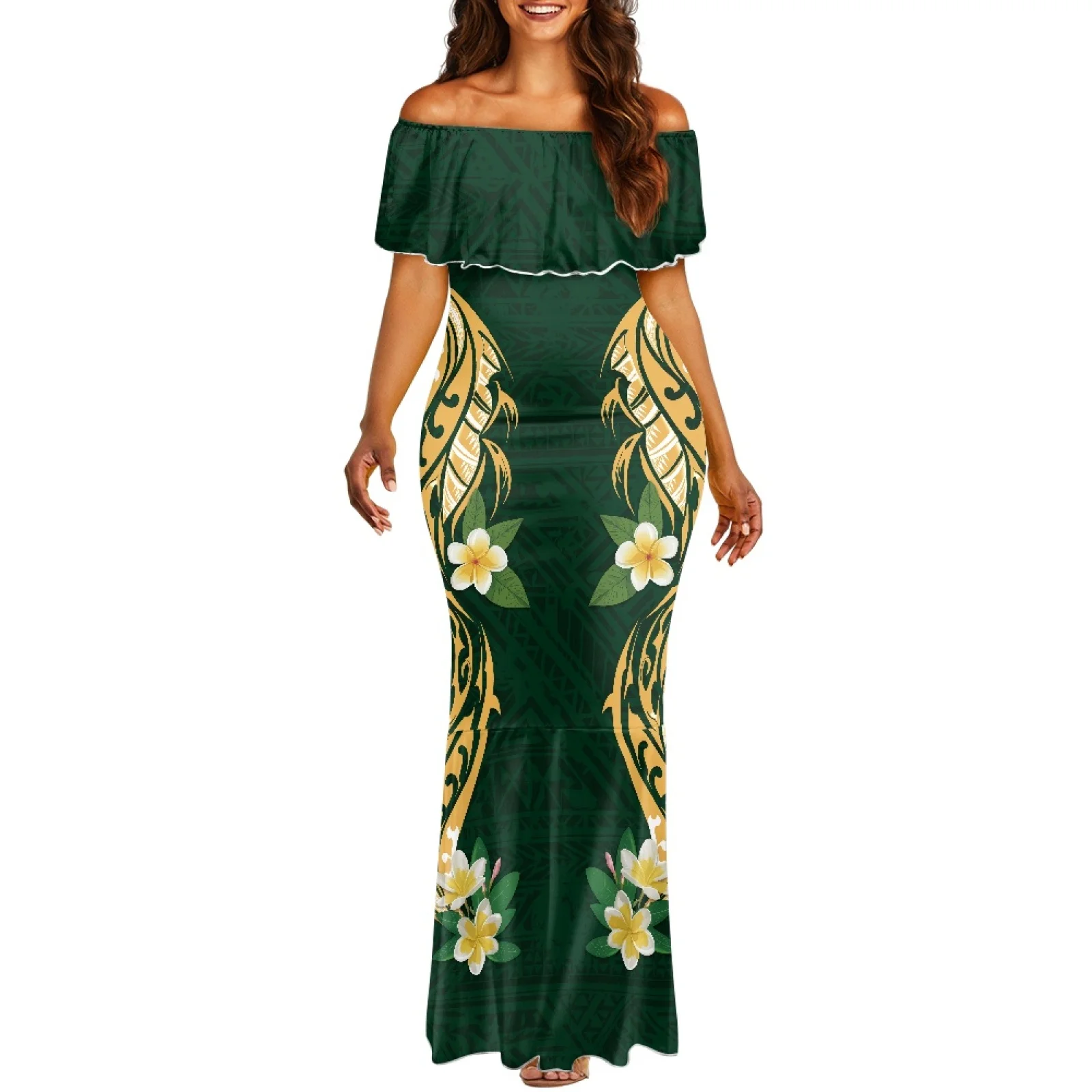 Polynesian Tribal Samoan Totem Tattoo Samoa Print Women's Long Bodycon Fishtail Dress Ruffle Sleeve Mermaid Party Dresses Ladies