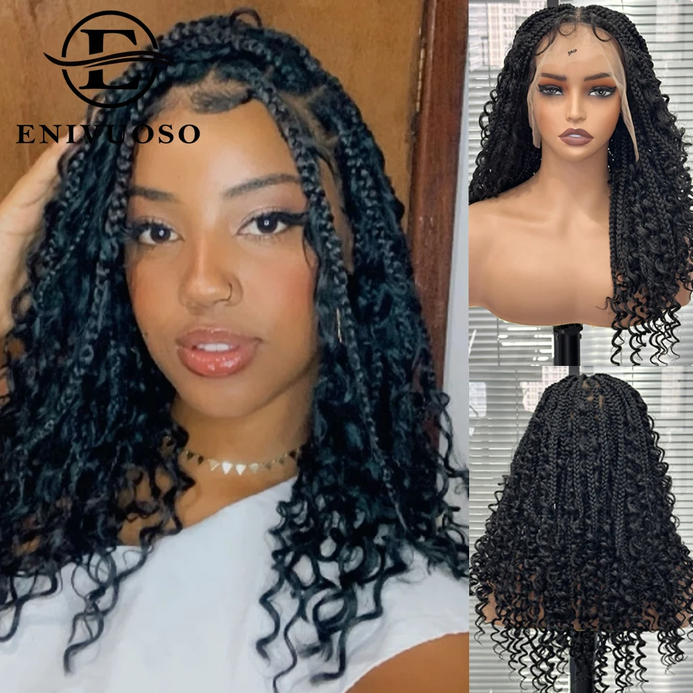 Short Bob Full Double Lace Front Braided Wigs for Black Women Synthetic Knotless Box Braided Wigs with Curly Ends