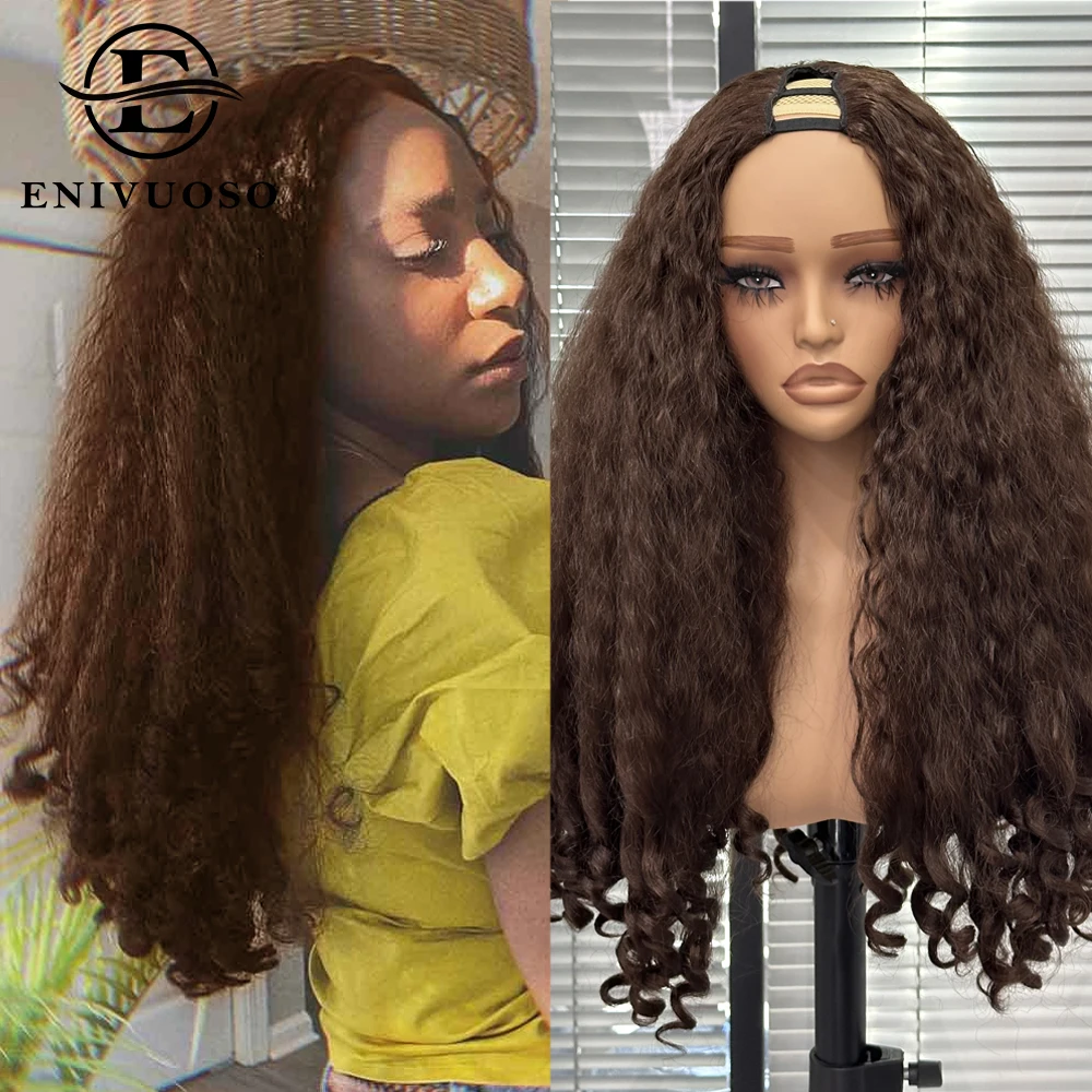 Chocolate Brown Afro Curly V Part Wigs with Bouncy Curls Synthetic Glueless Wigs for Black Women No Leave Out Clip in Half Wigs