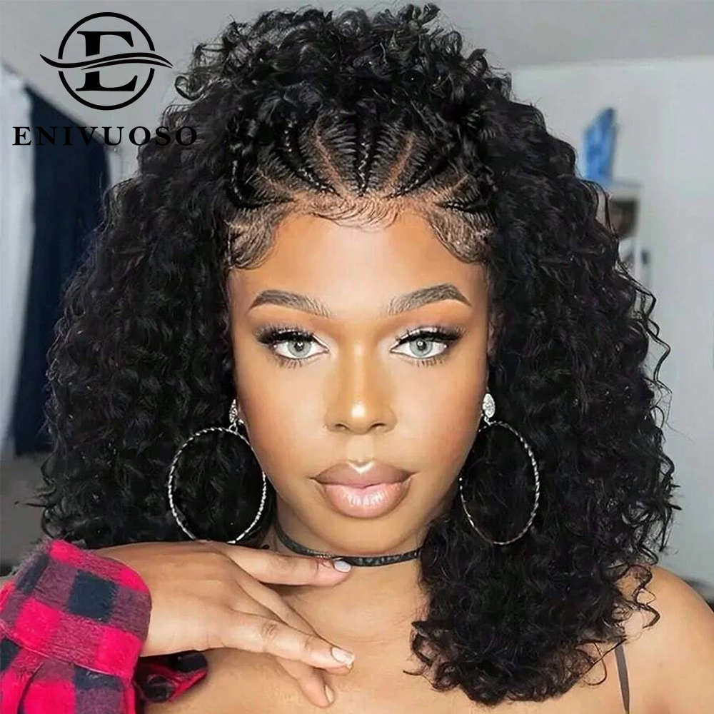 Curly Bob 13x6 Lace Frontal Wigs with Cornrow Braids 14Inch Deep Wave Braided Synthetic Hair Wigs with Baby Hair for Black Women