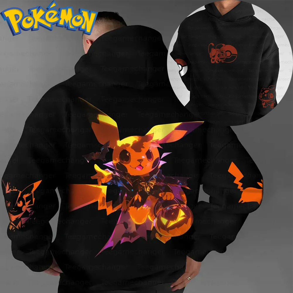 Pokemon Anime Pikachu Cotton Hoodie Harajuku Pants Set Black Character Print with Vampire Cape Pumpkin Lantern Bat Pattern