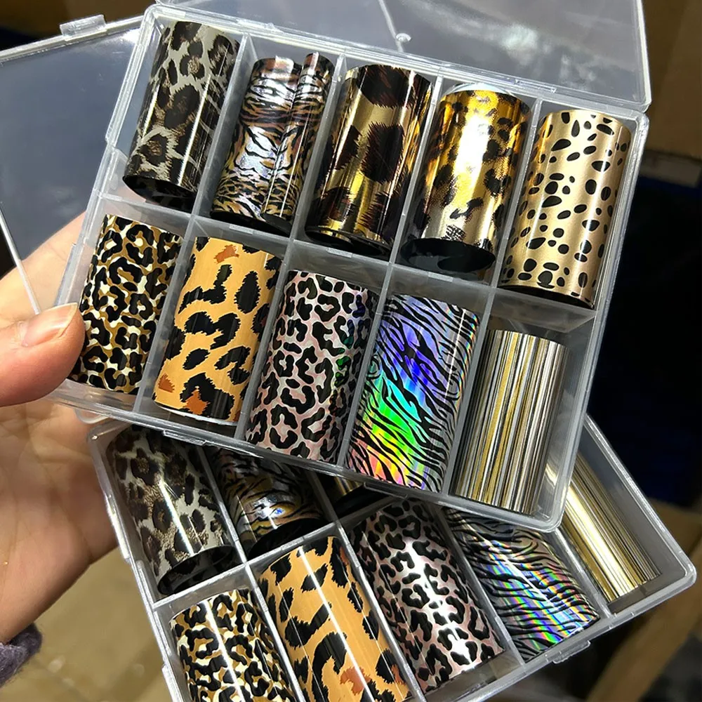 1Box 10Rolls 50*4CM Leopard Print Nail Transfer Foils Cheetah Print Nail Sticker Starry Animal Print Winter Manicure Accessories