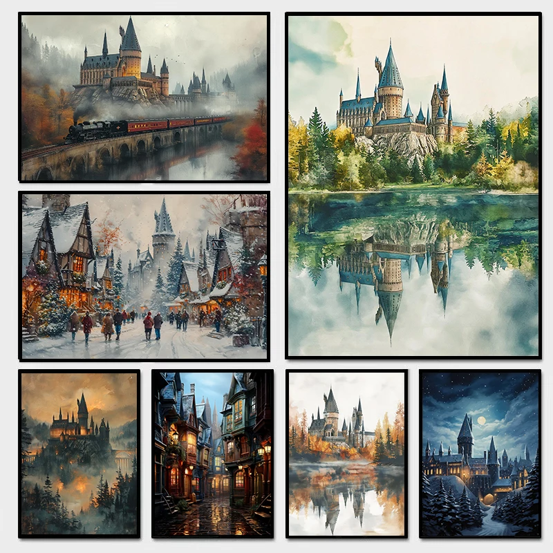 Dark Academia Fantasy Wizard Magic Castle Landscape Owl Train School Poster Canvas Painting Wall Art Pictures Home Decor