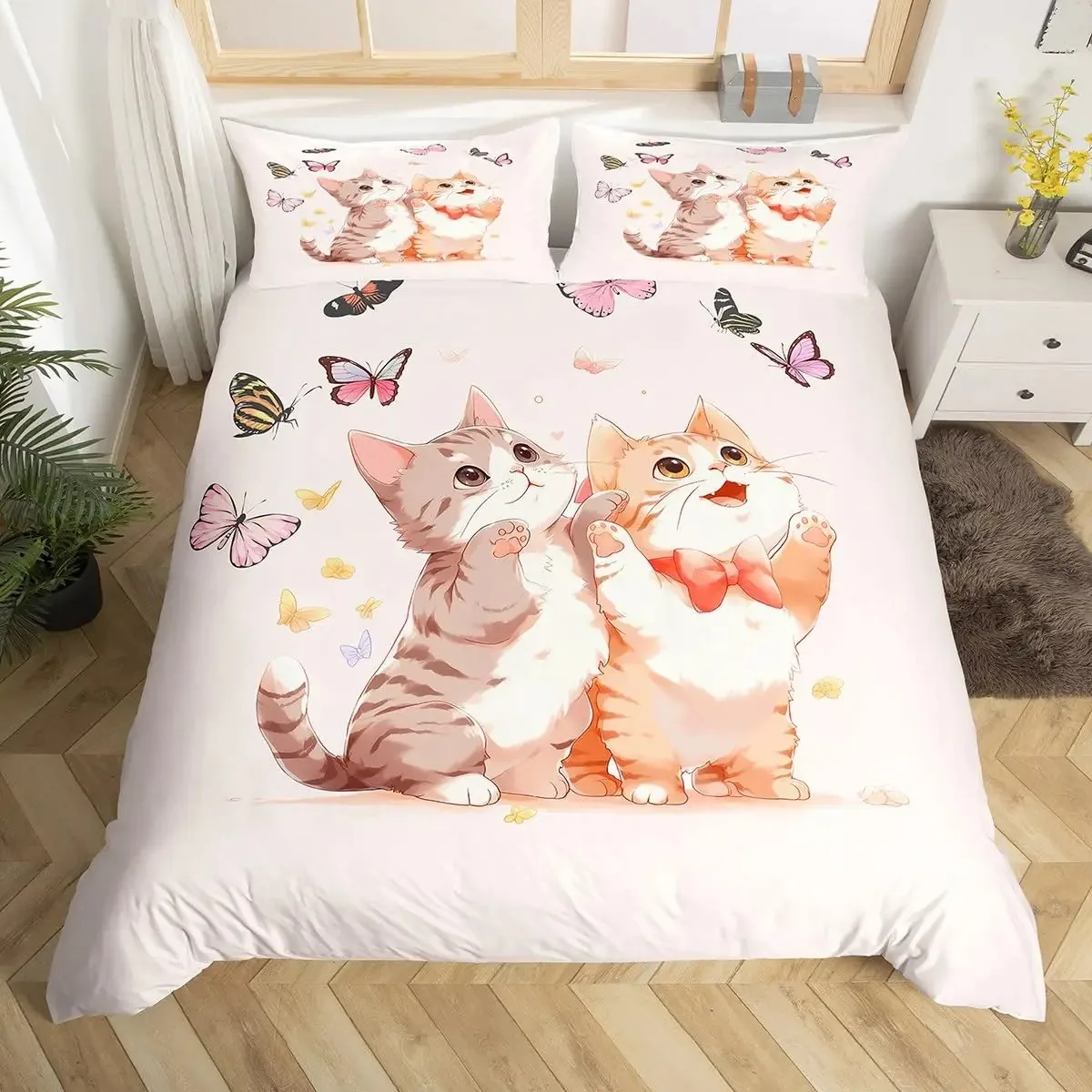 Kawaii Cat Duvet Cover Pink Bowknot Kitten Bedding Set Sweet Pet Animal Comforter Cover Princess Bow Girly Polyester Quilt Cover