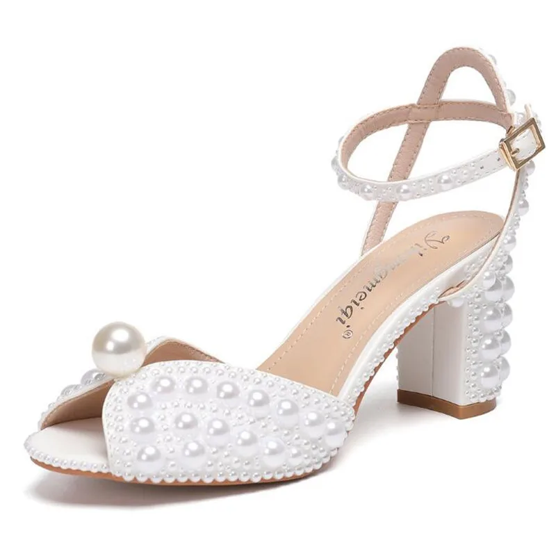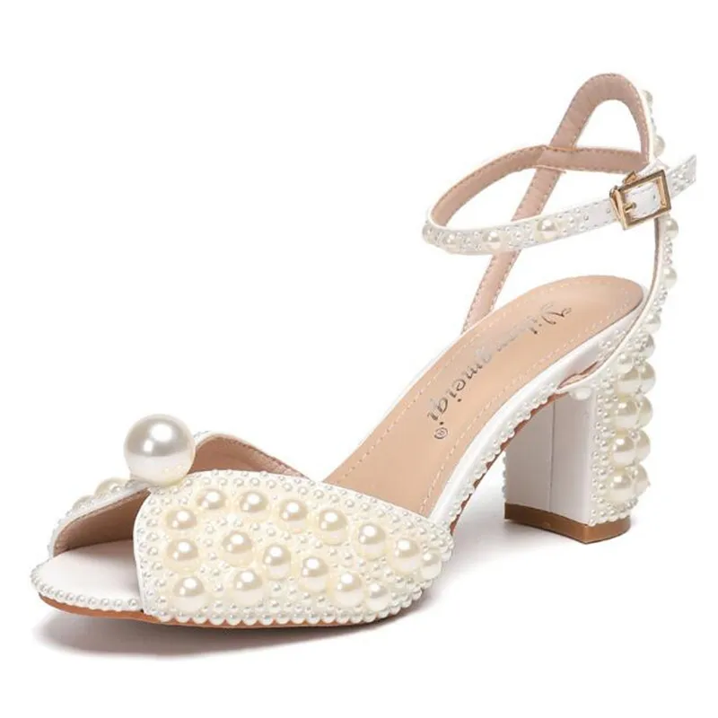 Luxury Handmade Pearl Peep Toe Women Sandals Fashion Summer Wedding Princess Thin High heels Elegant Party Prom Bridal Shoes