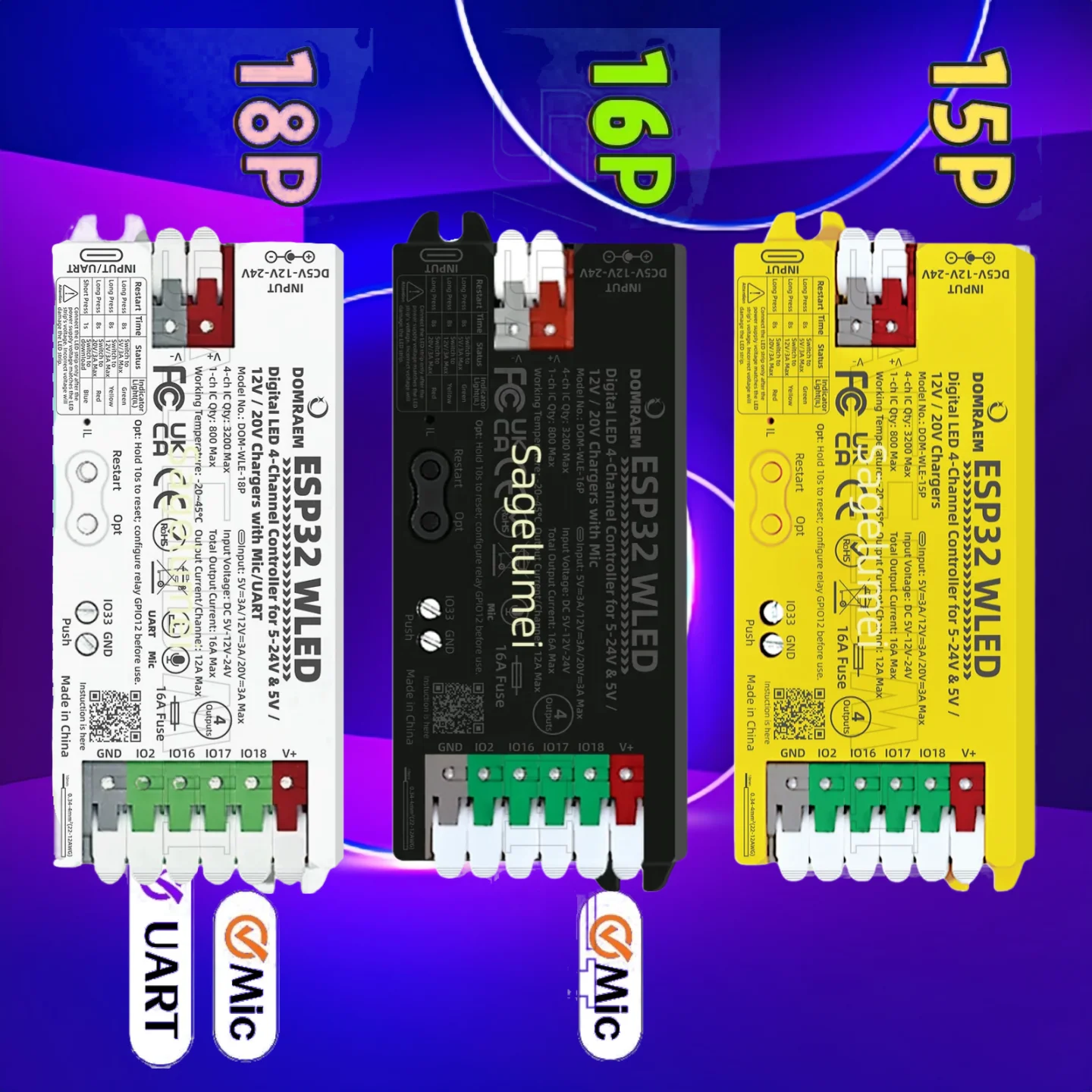 Dual PSU ESP32 WLED Digital LED Controller DOM-WLE-15P/16P/18P PD 5V/12V/20V with 4CH Outputs for WS2811/12B APA102 Pixel LEDs