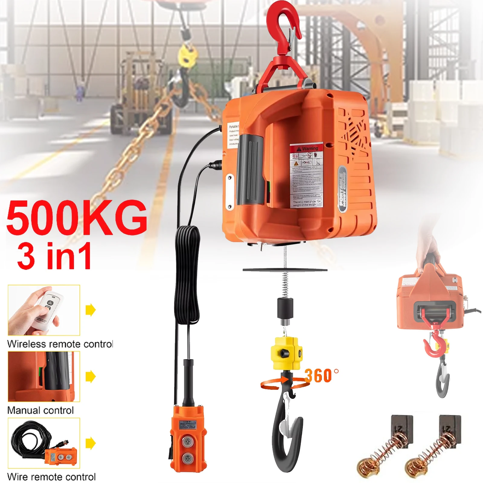 Portable Electric Hoist 1500W Wireless Remote Control Winch Crane Machine Hook Pulley System 500kg Capacity with Remote Control