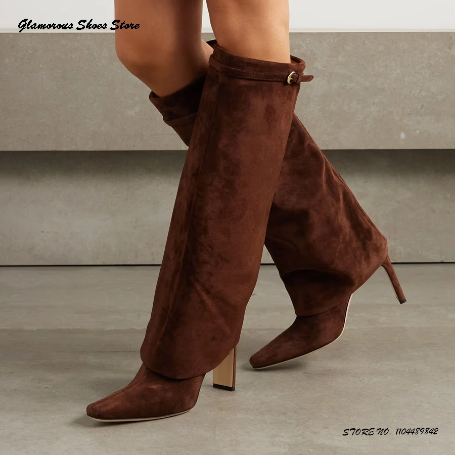 Buckled Suede Knee-high Boots Women's Spring Autumn Fold Over Pull On Trendy Shoes Square Toe Slim Chunky Heel Modern Boots