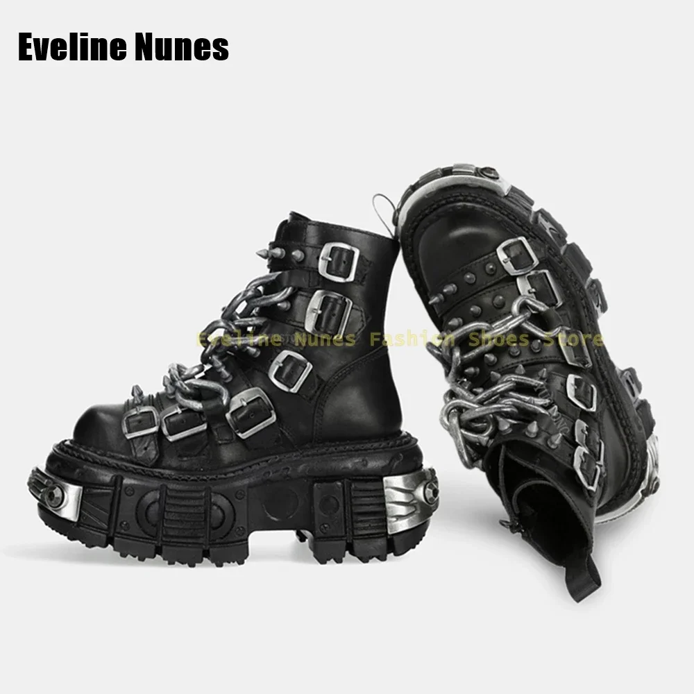 Metal Chain Rivet Punk Motorcycle Boots Round Toe Thick Sole Belt Buckle Cyberpunk Dark Style Plus Size Ankle Boots 2025 Trend