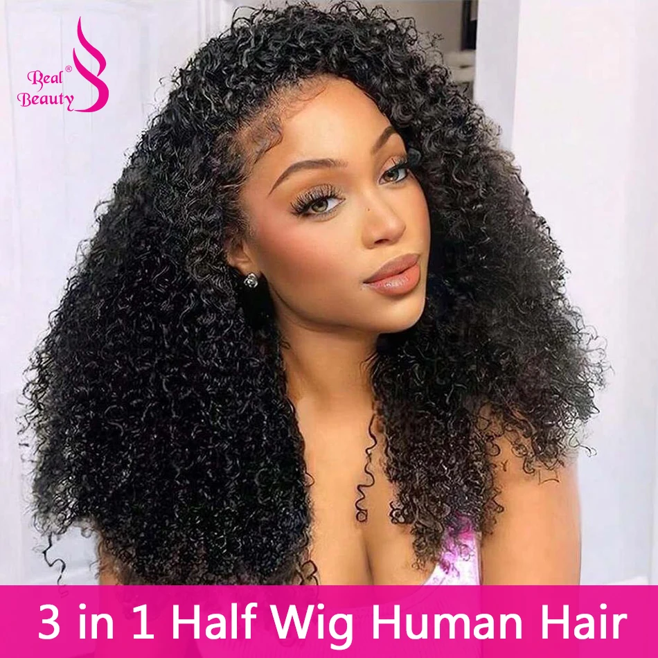 Kinky Curly Half Wig Glueless 3 IN 1 Human Hair Wig with Drawstring Seamless Afro Curly Clip Ins Wig for Black Women 200g 18inch