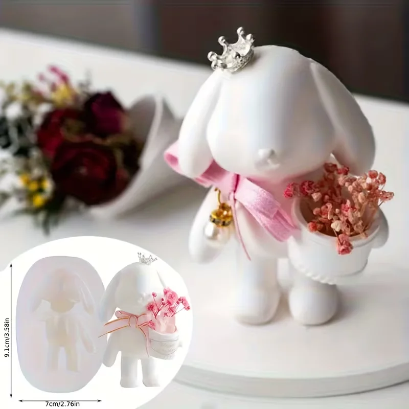 Rabbit Hold Bucket Ornament Silicone Mold DIY Gypsum Bunny Holding Flowers Making Platform Car Decoration Resin Mold Handicrafts