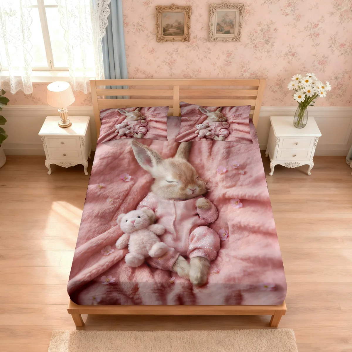 3pcs Cute Cartoon Rabbit Sleeping Printed Chipless Bed Sheet Set Multi Size Soft Bed Cover Bedroom Bedding Decoration