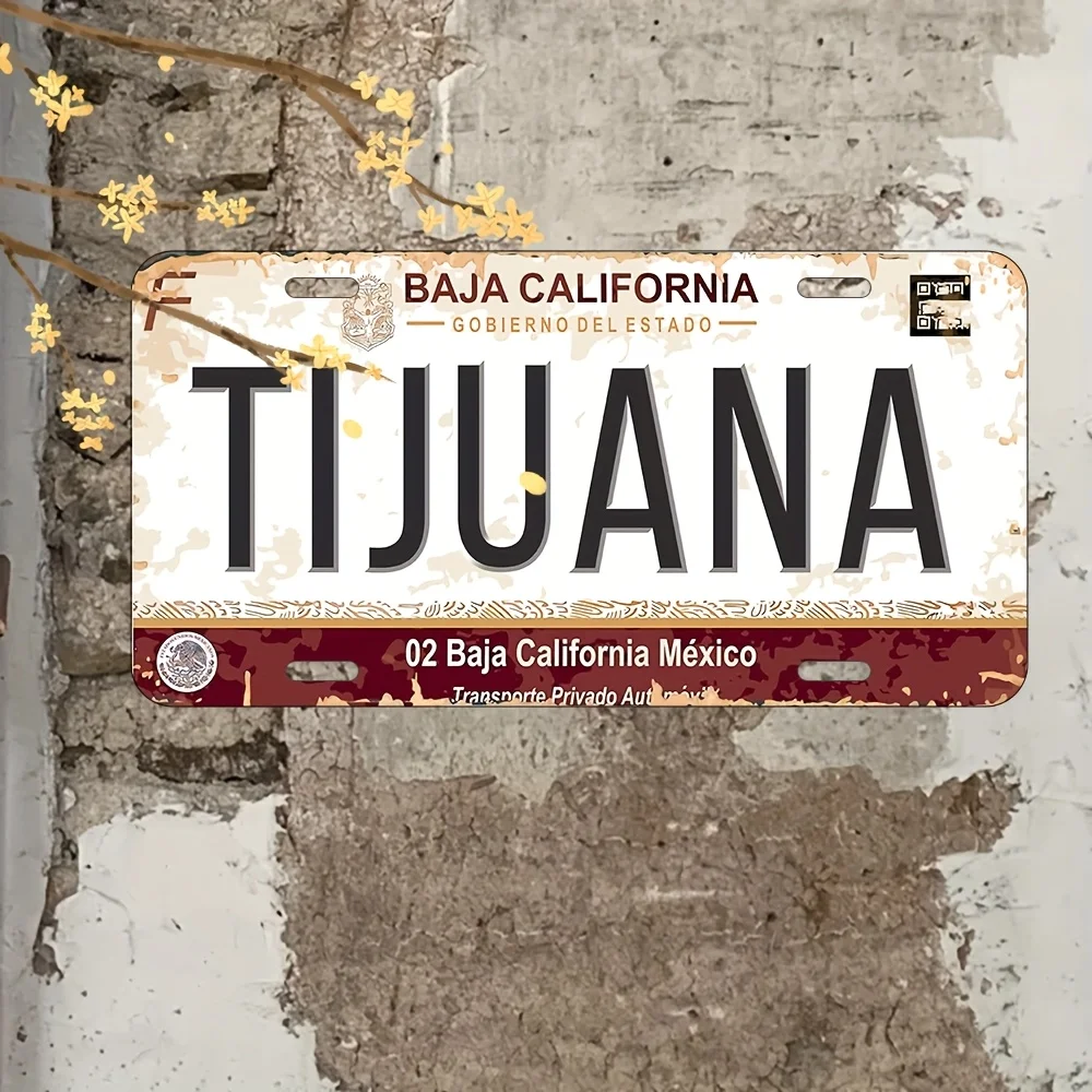 Vintage Mexican License Plate Metal Tin Sign - 15.24x30.48 cm Baja California & Tijuana Wall Art, Distressed White/Red/Black Ret
