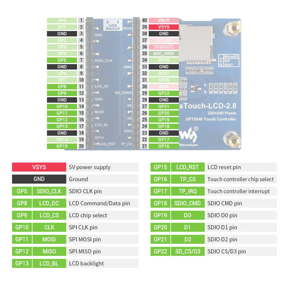 2.8inch Touch Display Module for Raspberry Pi Pico, 262K Colors, 320×240, SPI