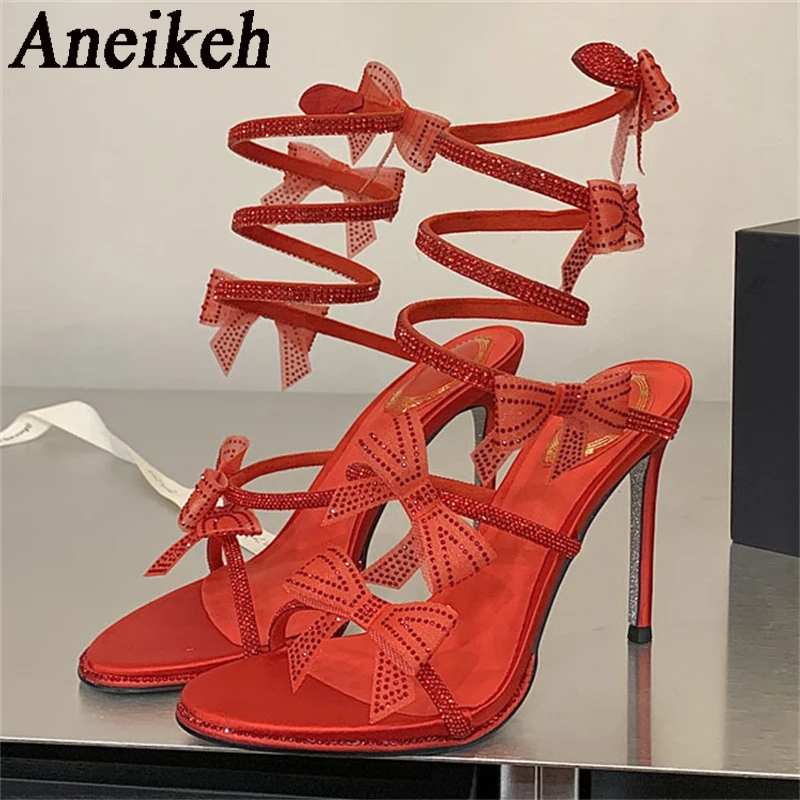 Aneikeh Sexy CRYSTAL Bow High Heels Sandals Woman Red Wedding Shoes Summer Ankle Strap Thin High Heels Open Toed Party Shoes