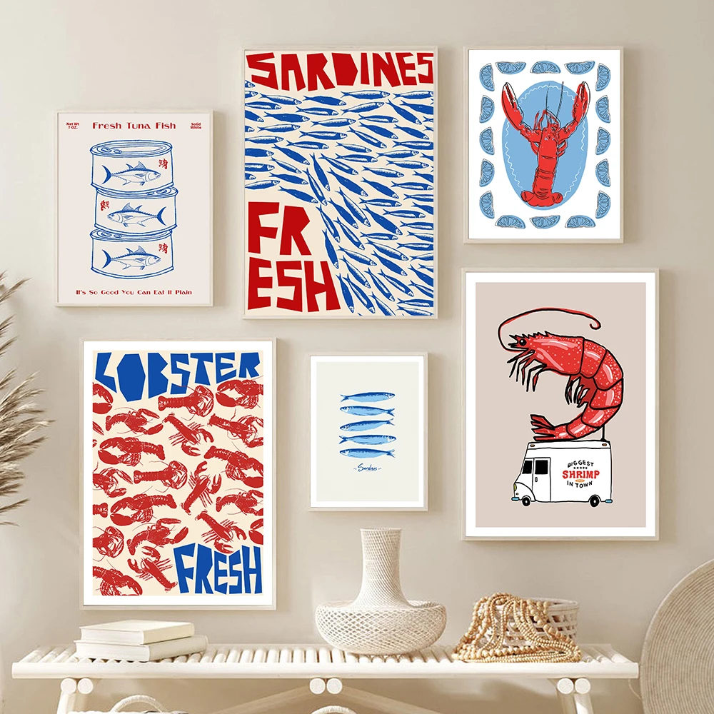 Kitchen Dining Room Poster Retro Shrimp Tuna Fish Sardines Red Lobster Wall Art Print Decor Wall Hanging Red Blue Canvas Picture