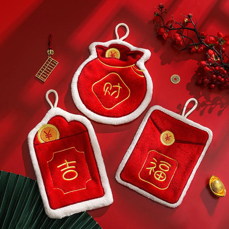Chinese New Year Red Envelope Shape Hand Towel With Hanging Loop Soft Absorbent Coral Towels Quick Dry For Kitchen Bathroom