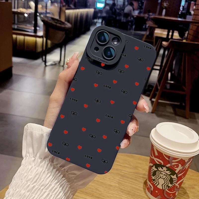Love Heart Bow High-end Black Shockproof Soft Phone Case For iPhone 17 16 15 14 13 12 11 Pro Max XS XR 8 Plus Silicone TPU Funda