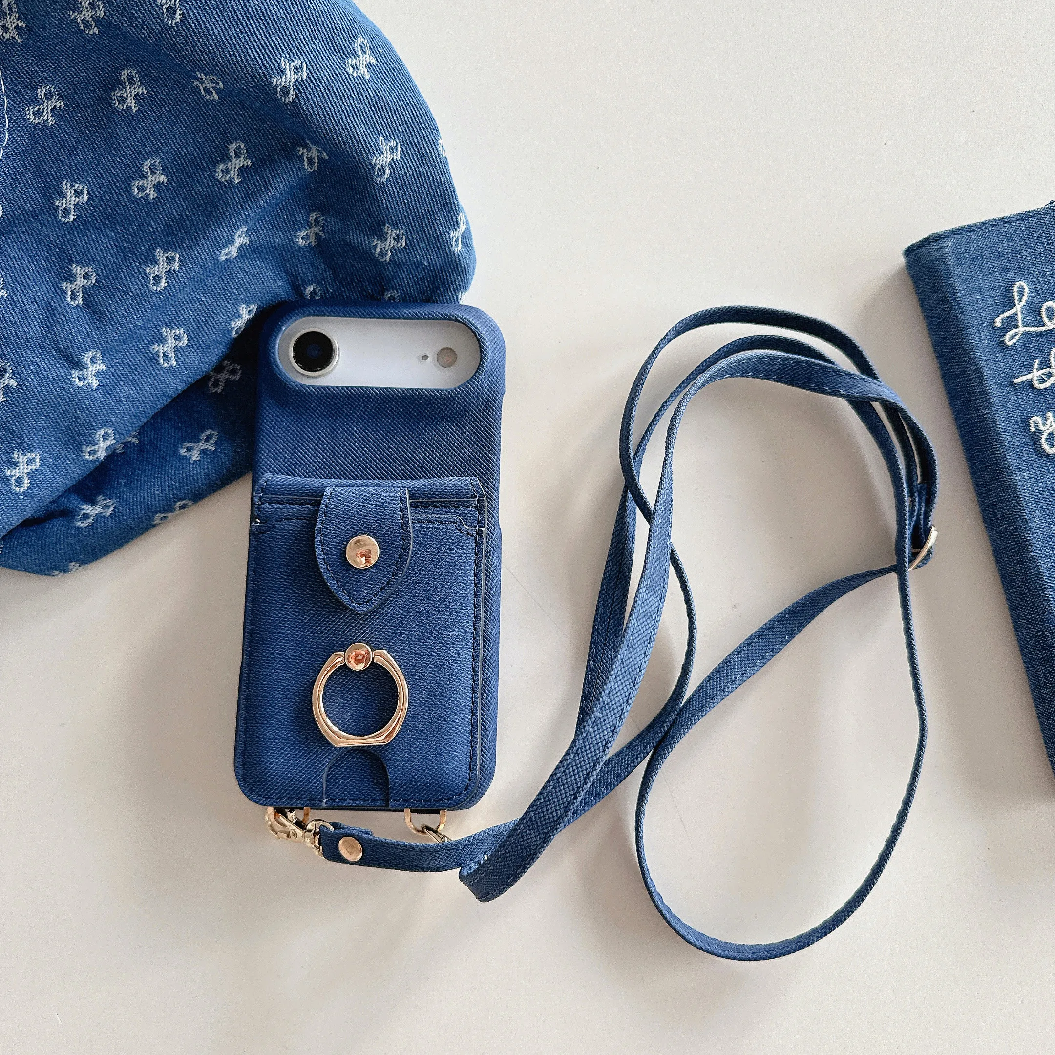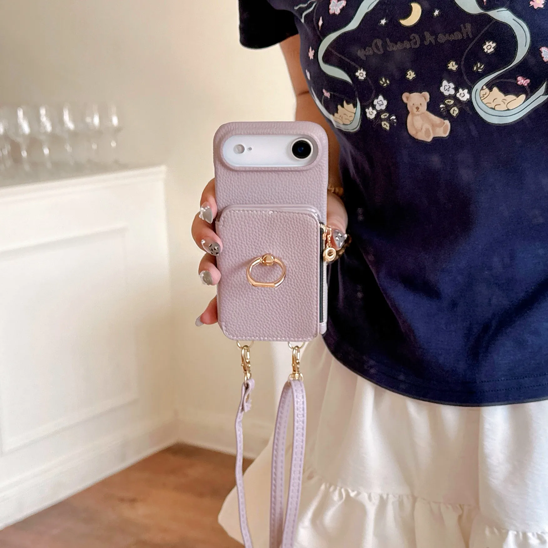Crossbody Zipper Card Bag Wallet Leather Case For iPhone 16 Pro Max 15 Plus 17 Air 14 13 12 11 Lanyard Grid Ring Holder Cover