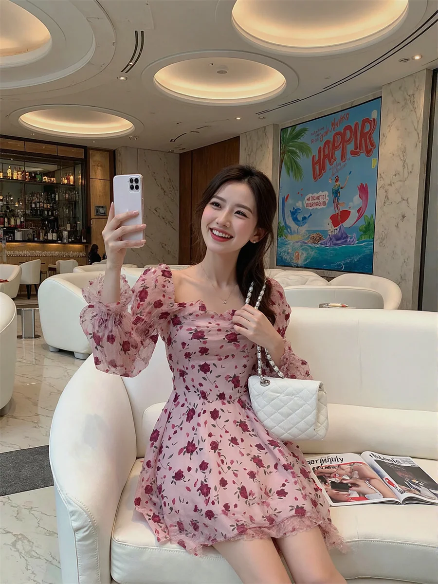 Floral Puff Folds Long Sleeve Dresses Women'S Clothing Fall Flare Oversized Birthday Lady'S Bodycon Multiway One-Line Distressed