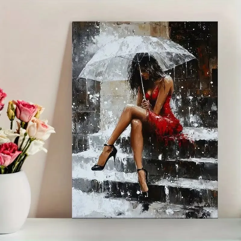 Woman in Red Dress Sat on The Steps Hold Umbrella Poster Print Animal Canvas Painting Wall Art Picture for LivingRoom Home Decor