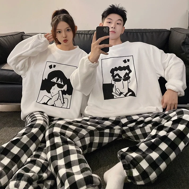 Kawaii Crayon Shin-Chan Couple Pajamas Set New Men's/women's Fashion Casual Pajama Plush Coral Fleece Winter Cartoon Homeclothes