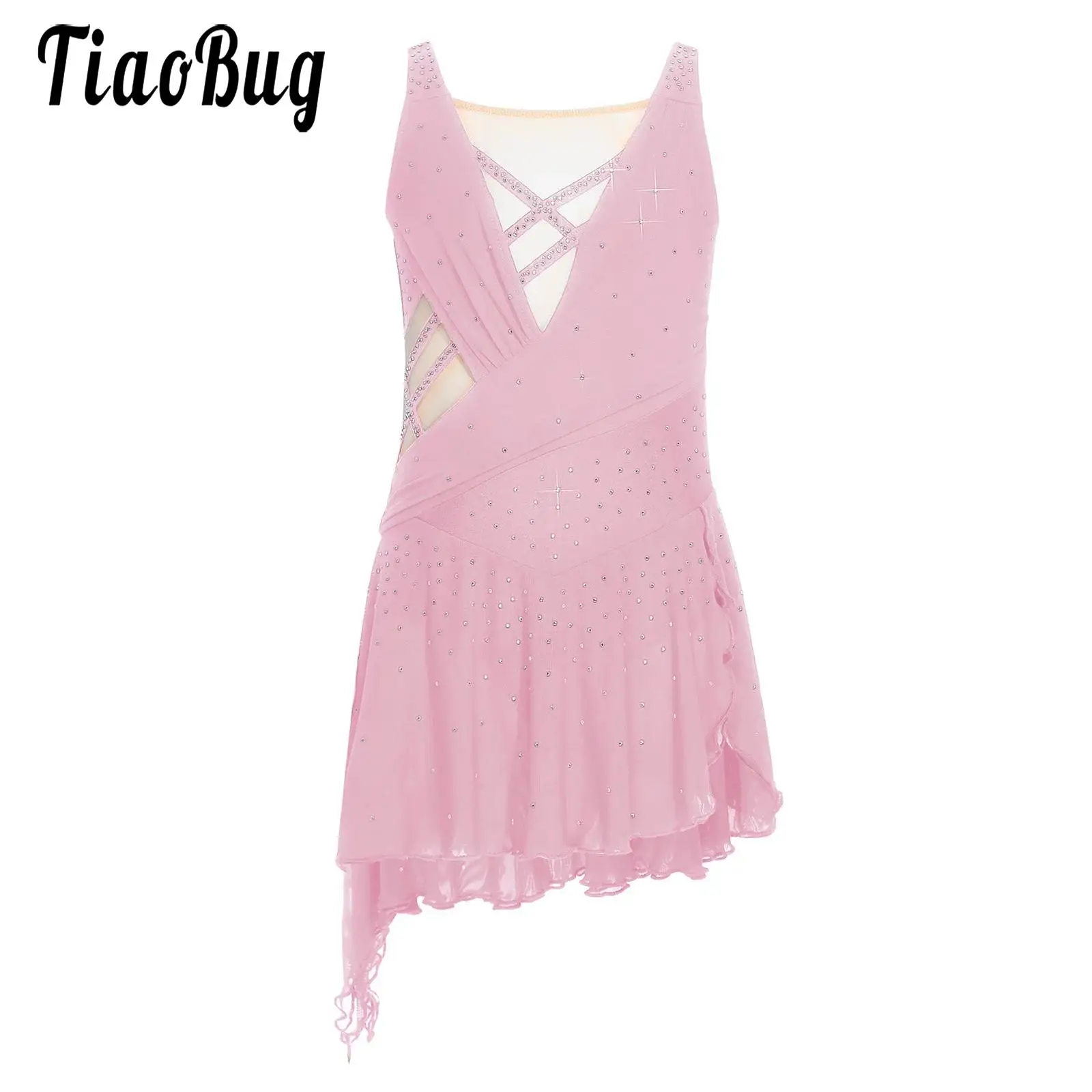 Kid Girls Lyrical Ballet Dance Dress Skating Costume Rhinestone Straps Backless Side Slit Flowy Irregular Hem Leotard Tutu Dress