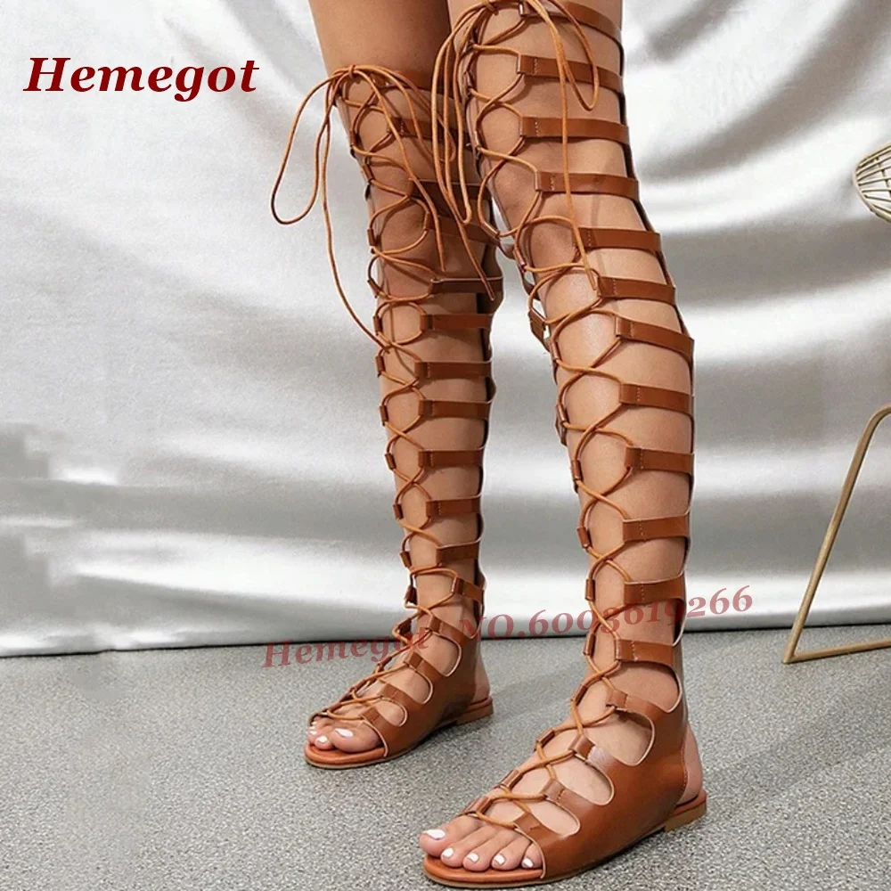 Brown Lace-Up Thigh Flats Gladiator Sandals with Zip Open Toe Hollow Out Slingback Women's Sandals Leather Retro Casual Shoes
