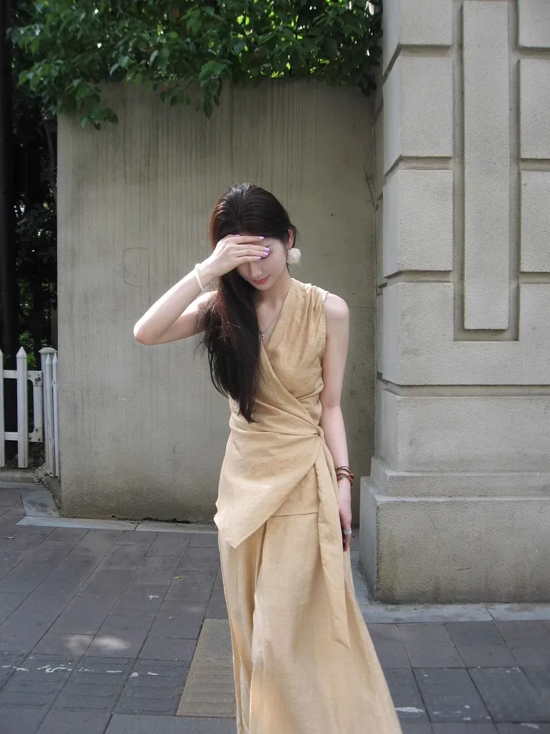 Ele White Moonlight Design Two-Piece Set Summer New Arrival Women's Faion V-ne Top Wide Leg Pants Pure Bland Sle