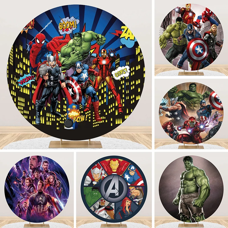 Superhero City Avengers Round Backdrop Kids Boys Birthday Party Spiderman Hulk Decorations Circle Backdrop Cover Elastic Cloth