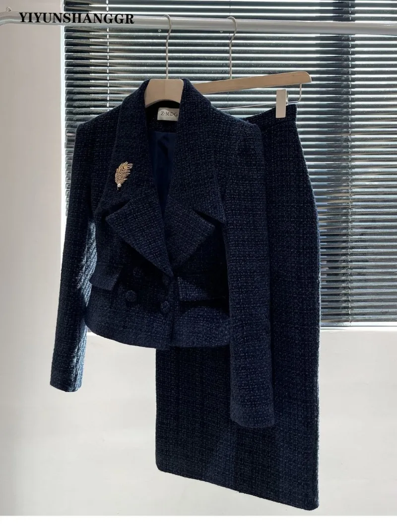 New Autumn Winter Tweed Women's Suit High End Elegant Lapel Long Sleeve Short Jacket + Split Slim Skirt Solid Color 2 Piece Set