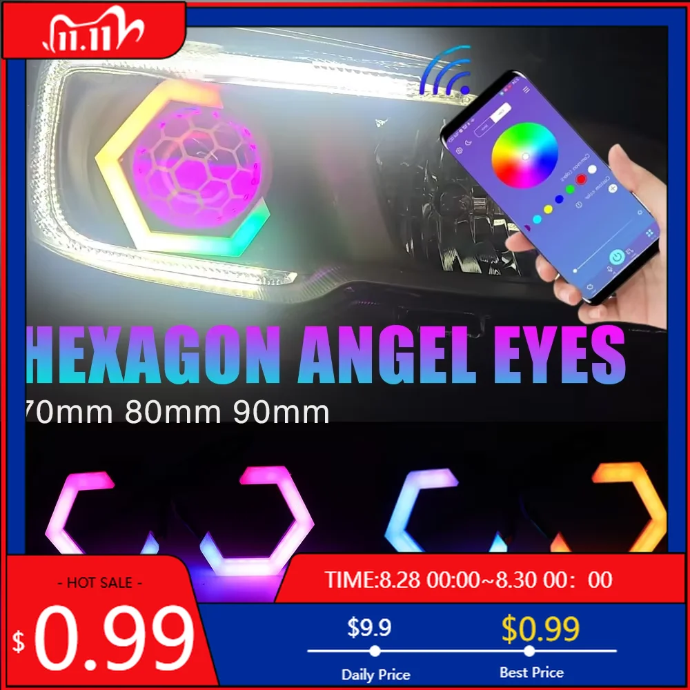 Hot 60mm 70mm 80mm 90mm RGB Hexagon LED Angel Eyes with Turn Signal Halo Rings Car Headlights Drl 12-24V for M Interior Stickers