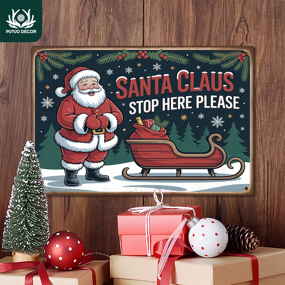 2D Flat Putuo Decor 1pc Vintage Metal Tin Sign, SANTA CLAUS STOP HERE PLEASE, Wall Art Decor for Home Christmas Party, Gift