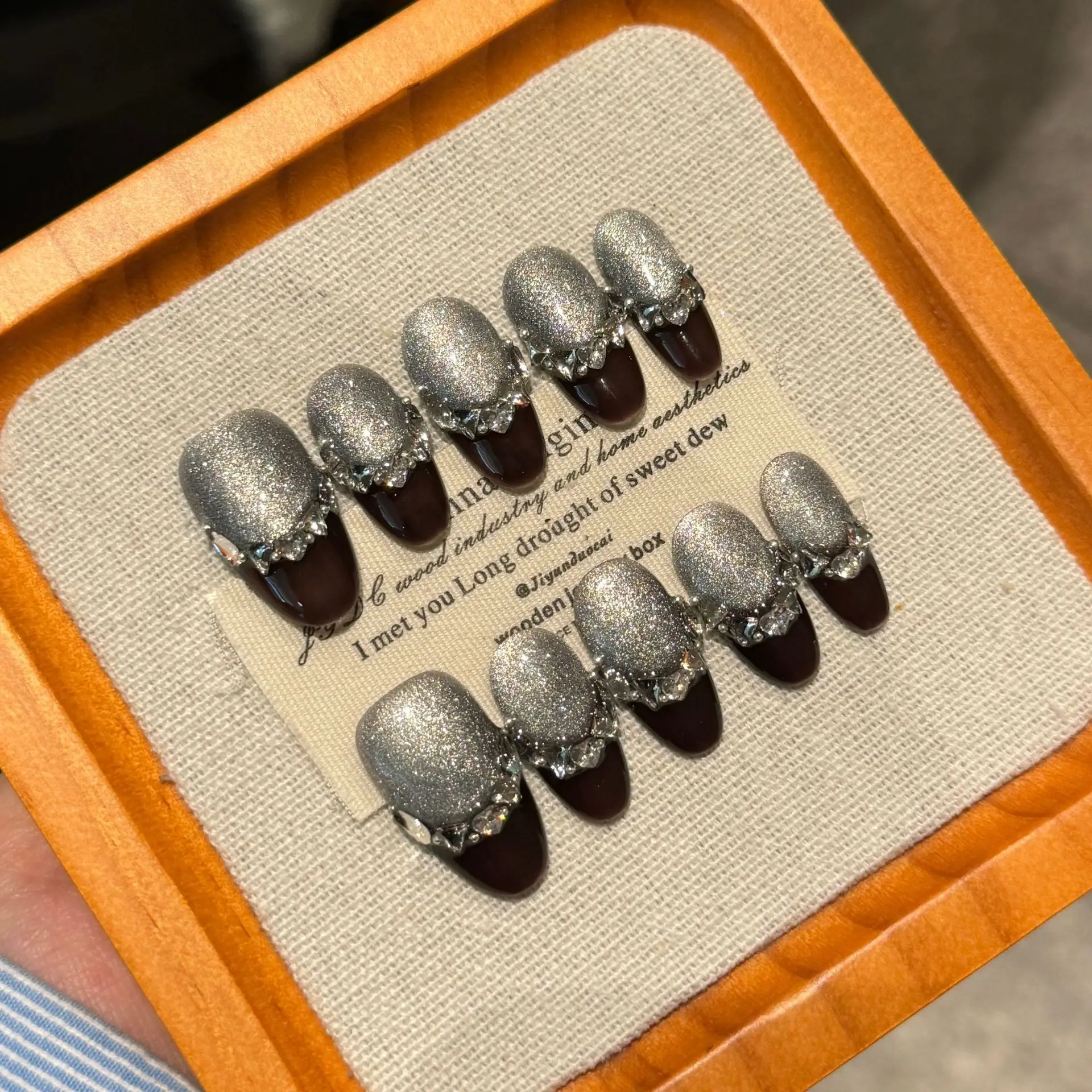 10pcs Black Cat's Eye French Tips Press On Nails Handmade Glitter Silver Short Almond Fake Nails Shiny Rhinestone False Nail