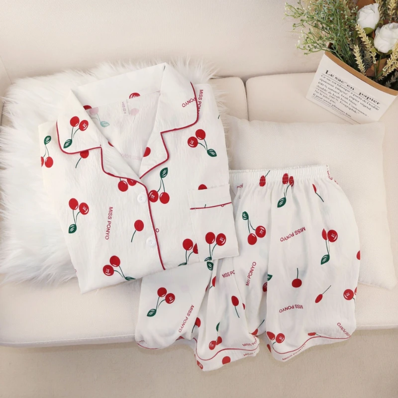 Summer New Girl Short Sleepwear Women's Cardigan with Sweet and Cute Collar Cherry Nightwear Set Ladies Pajamas Homewear