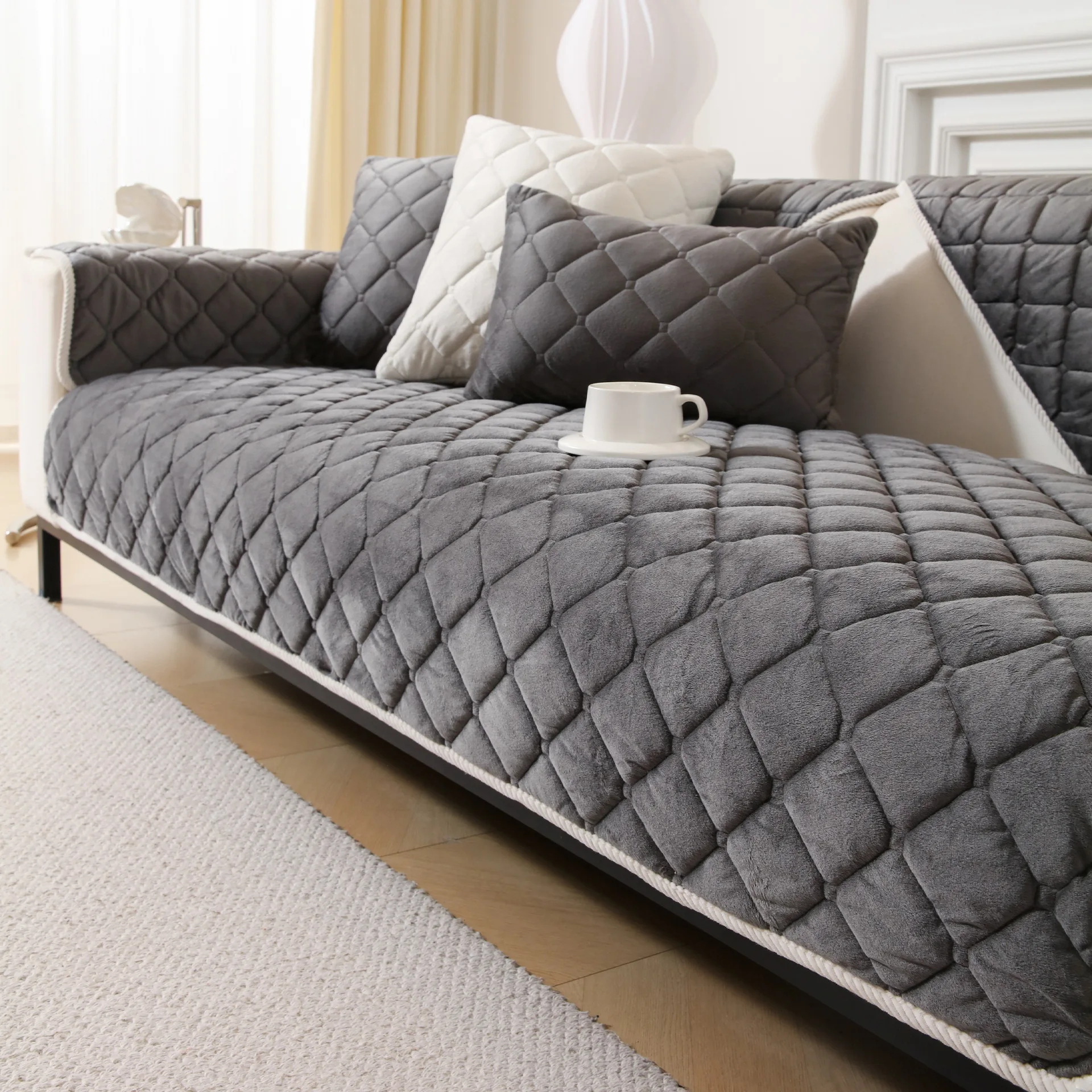 Thicken Squares Quilting Solid Sofa Cover, Delicate Wide Bording Sofa Pad with Filling Sofa Towel for Living Room Couches