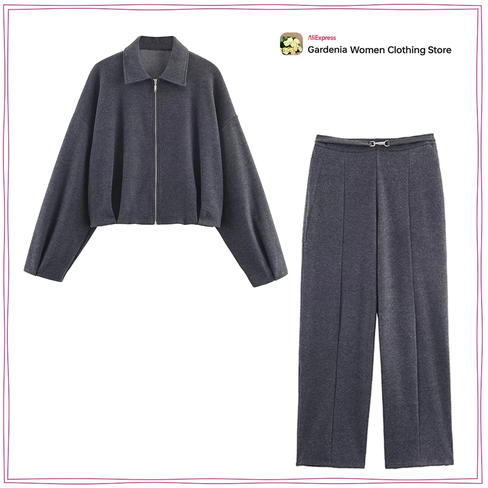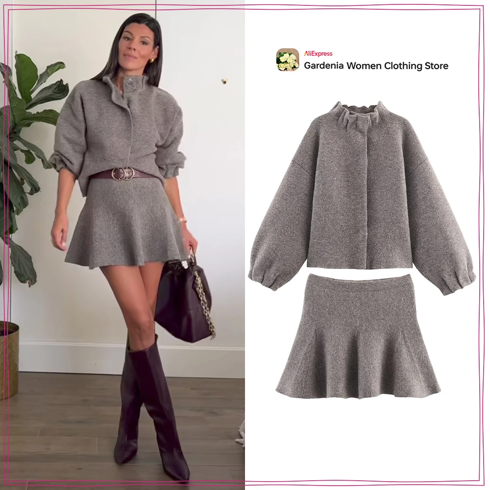 Women Elegant Chic Gray Knit Dress Sets Stylish Autumn 2 Piece Set High Neck Knit Bomber Jacket Matching Tonal A-line Mini Skirt