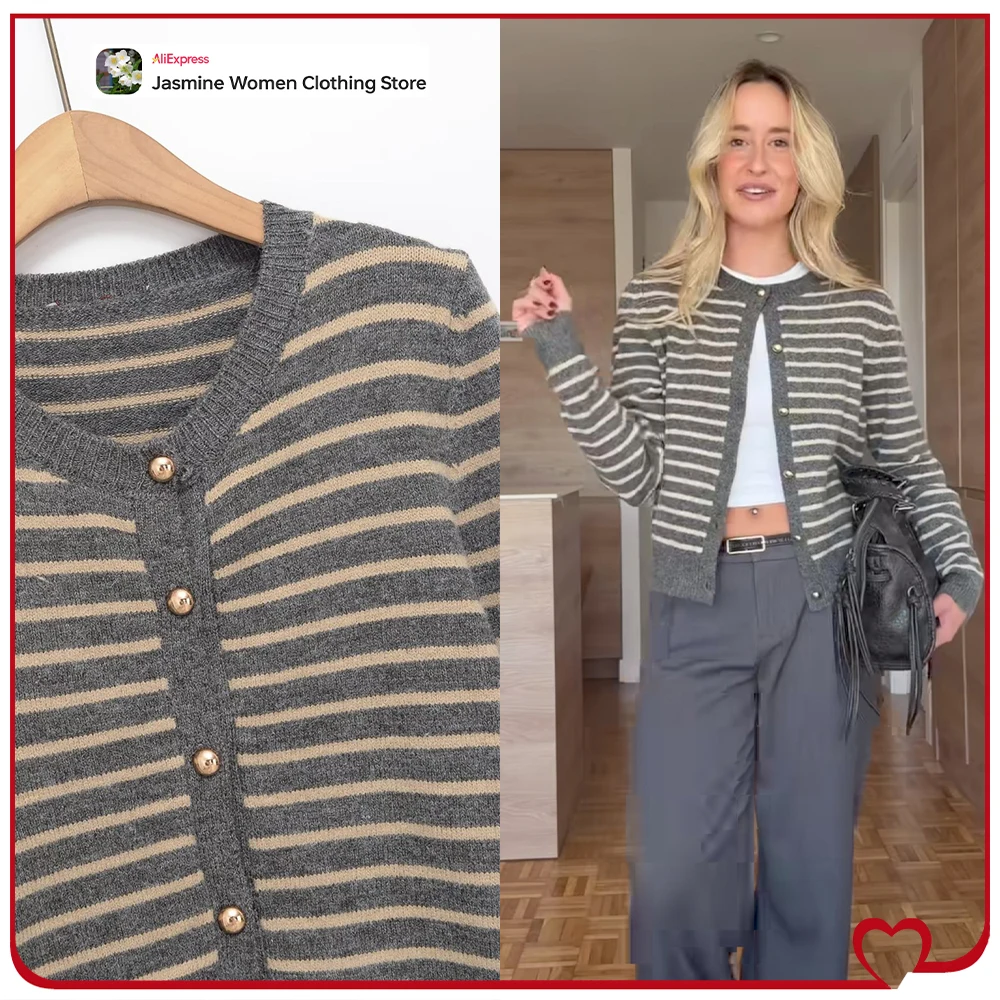 Elegant Chic Women's Soft-touch Striped Cardigan New in Gorgeous O-Neck and Long Sleeves Knitted Jacket Stylish Autumn Knitwears