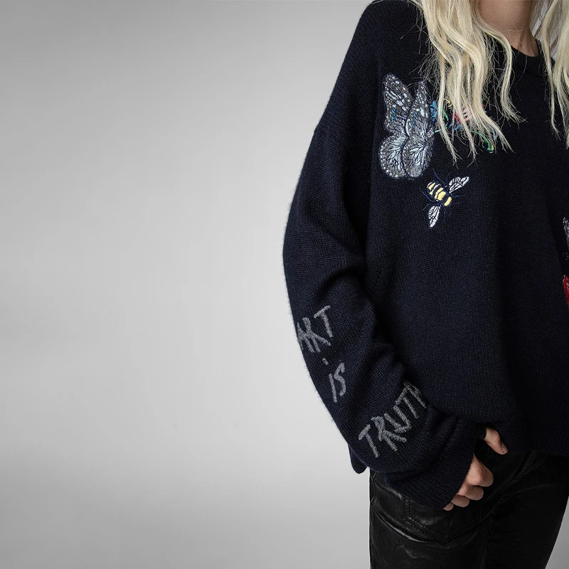 O-Neck Sweater Women Loose Navy Blue Jumper Letter Embroidery Cashmere Top Butterfly Flower Zadig Sweater Casual Winter Pullover