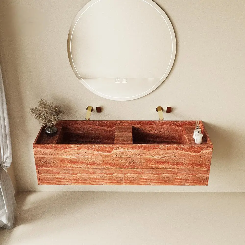 "Double Sink Vanity Set: Italian Red Travertine, Dual Faucets, Narrow Frame Deep Basin & Child-Safe Edges - Premium Bathroom"