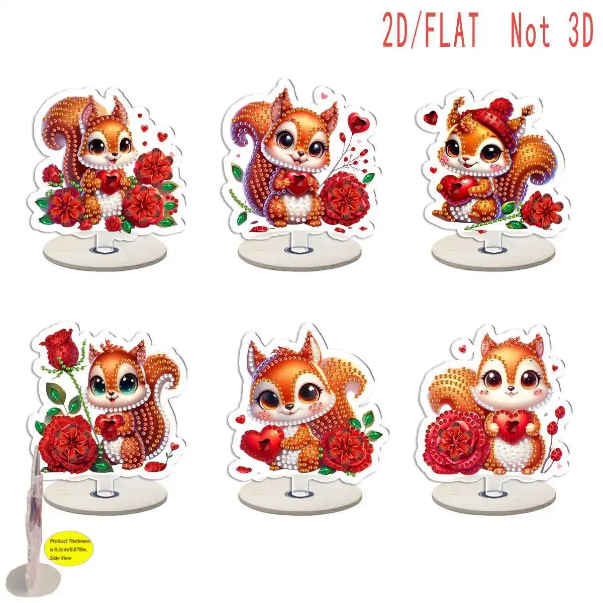 Six-piece diamond painting acrylic desktop ornament set with rotating base, featuring Valentine's Day roses and squirrels.