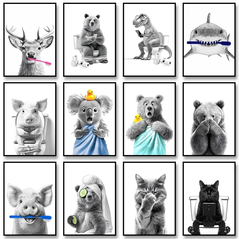 1PC Frameless Funny Animal Reading Newspaper on Toilet Poster Canvas Painting Monkey Dog Black Cat Bathroom Wall Art Home De