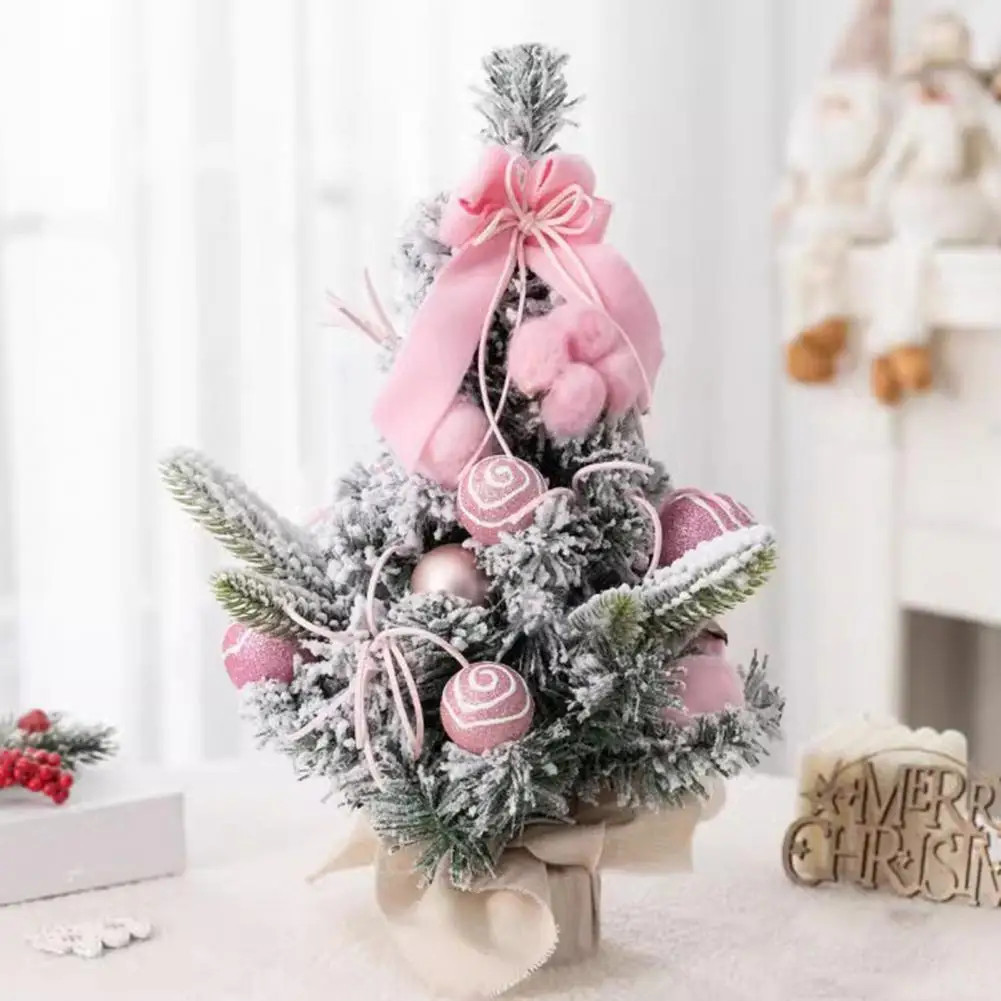 Snowy Mini Christmas Tree Small Tabletop Artificial Flocked Tree with Balls Bow And Cloth Bag Base Xmas Home Decoration