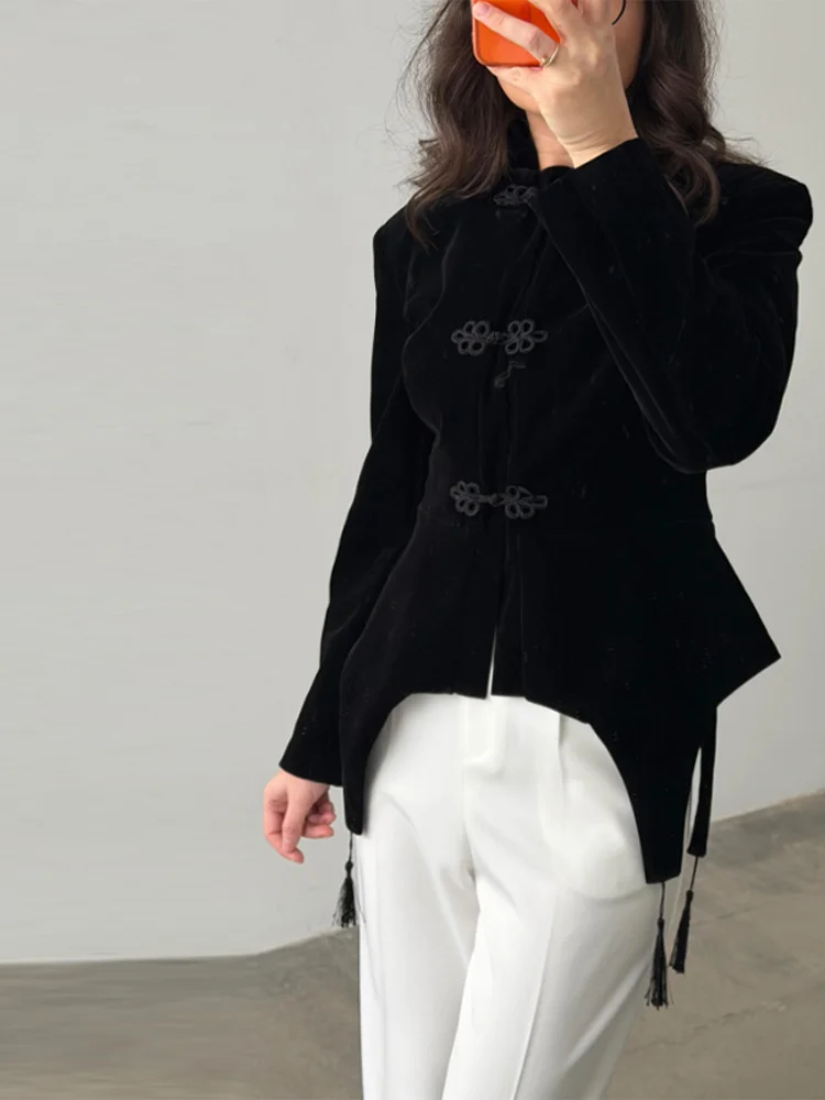 Black Velvet Tassel Jacket Knot Button Asymmetric Hem Long Sleeve Slim Fit Elegant Daily Commute Streetwear Fashion Outerwear