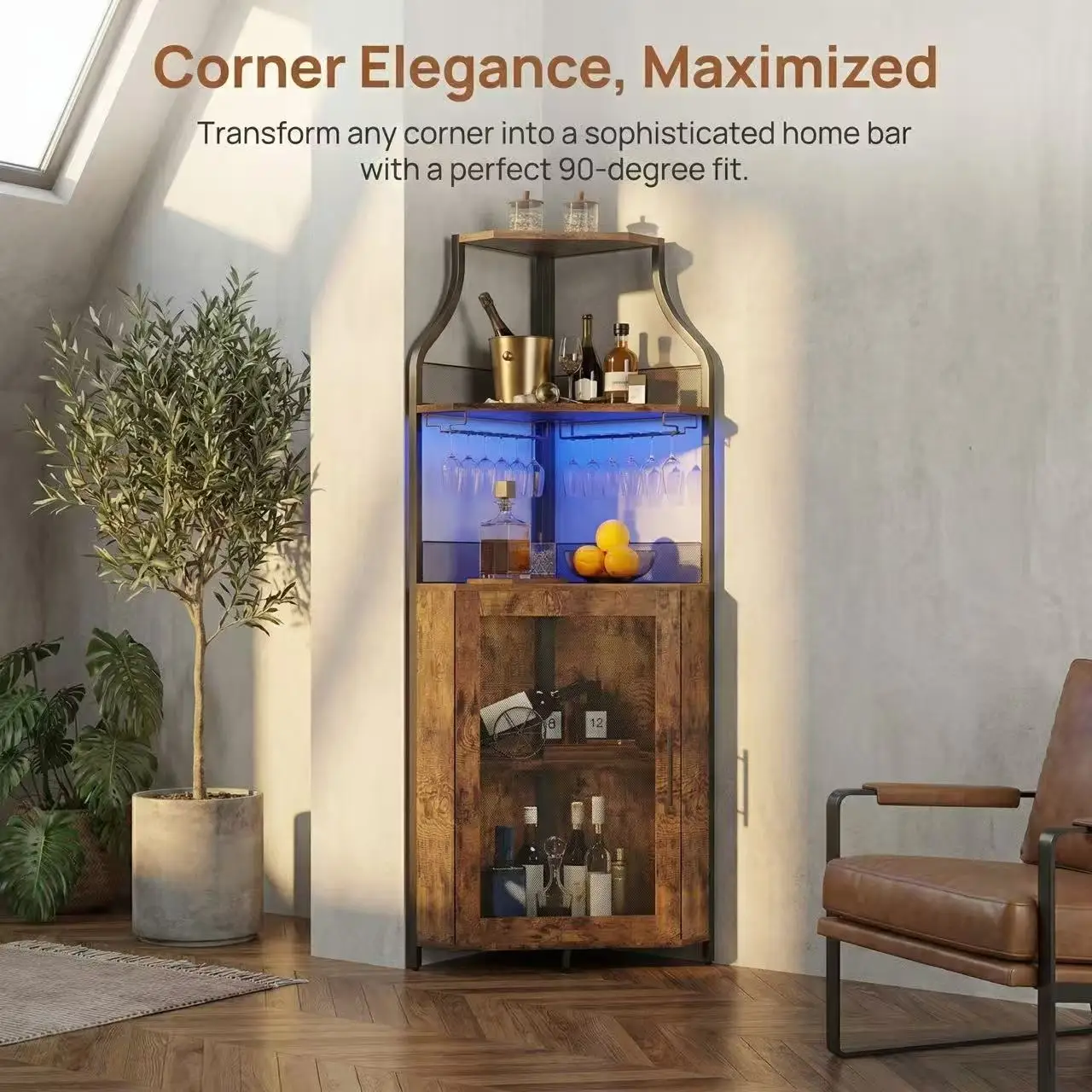 Mueble Bar Esquinero de 5 Niveles con Luces LED, Estante para Vinos Extraíble y Almacenamiento, Portavasos, Puertas de Malla Metálica, Estantes Ajustables